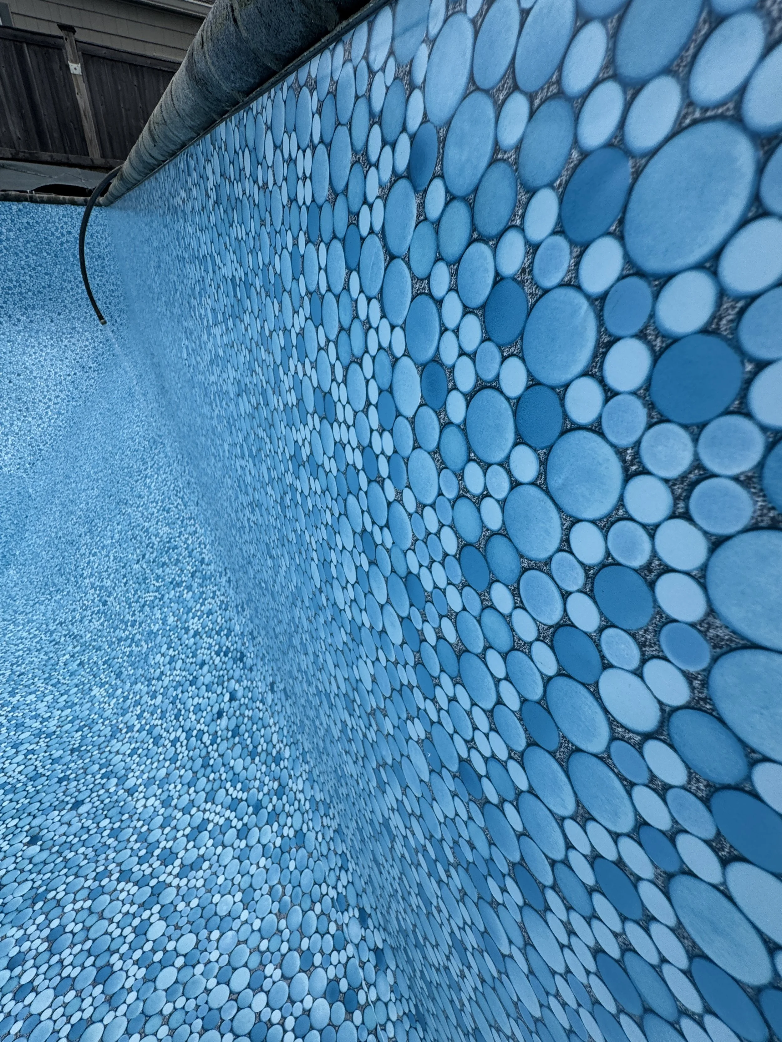 The Bubbles & Bliss liner features an all-over mosaic pattern inspired by the natural movement of the ocean, combining light and dark sea-foam tones to create a bright, multidimensional pool finish.