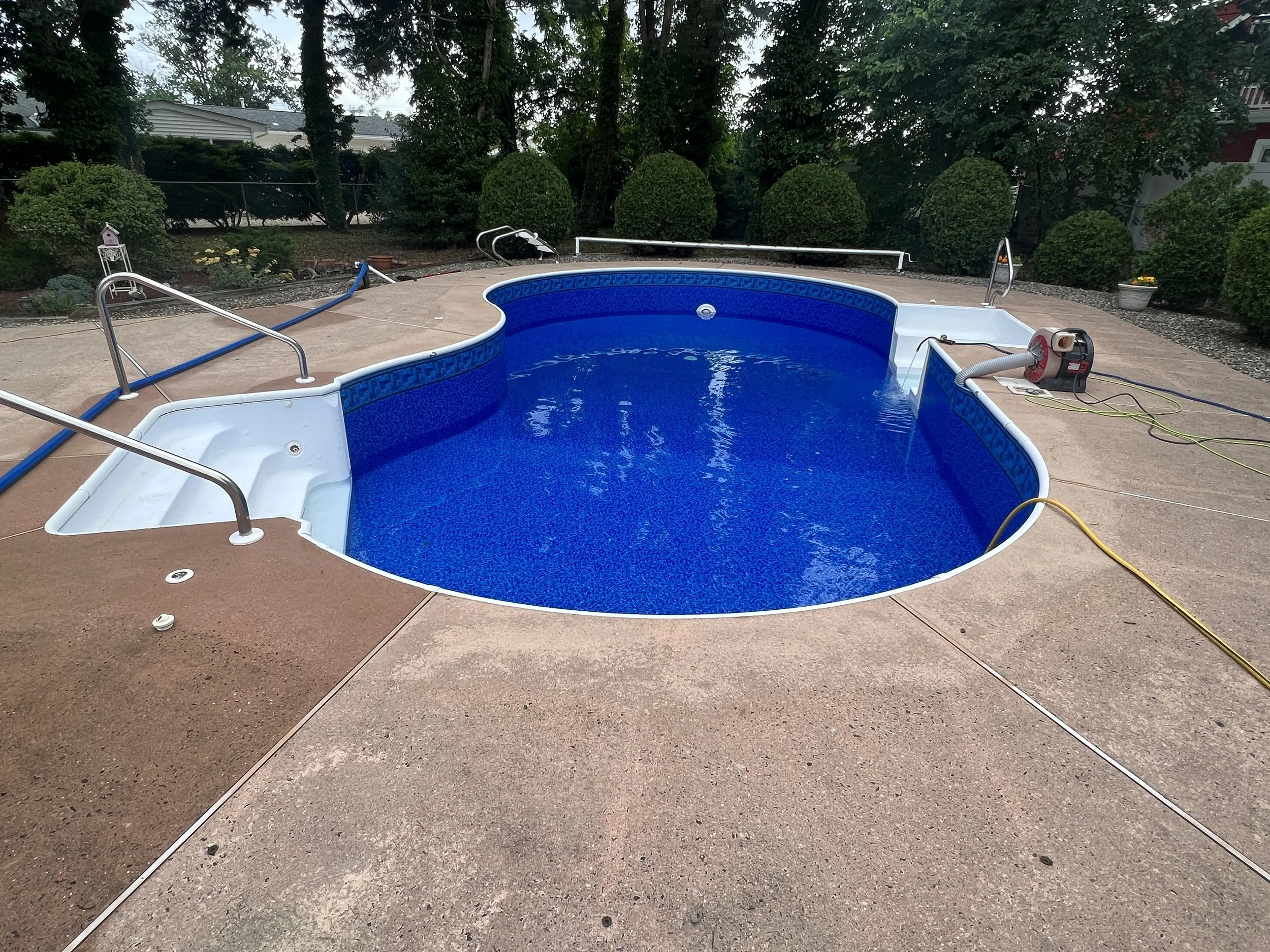 This liner features the Allentown tile border, a decorative band that runs along the top of the pool, paired with the Dark Blue River Print pattern throughout the rest of the liner.
