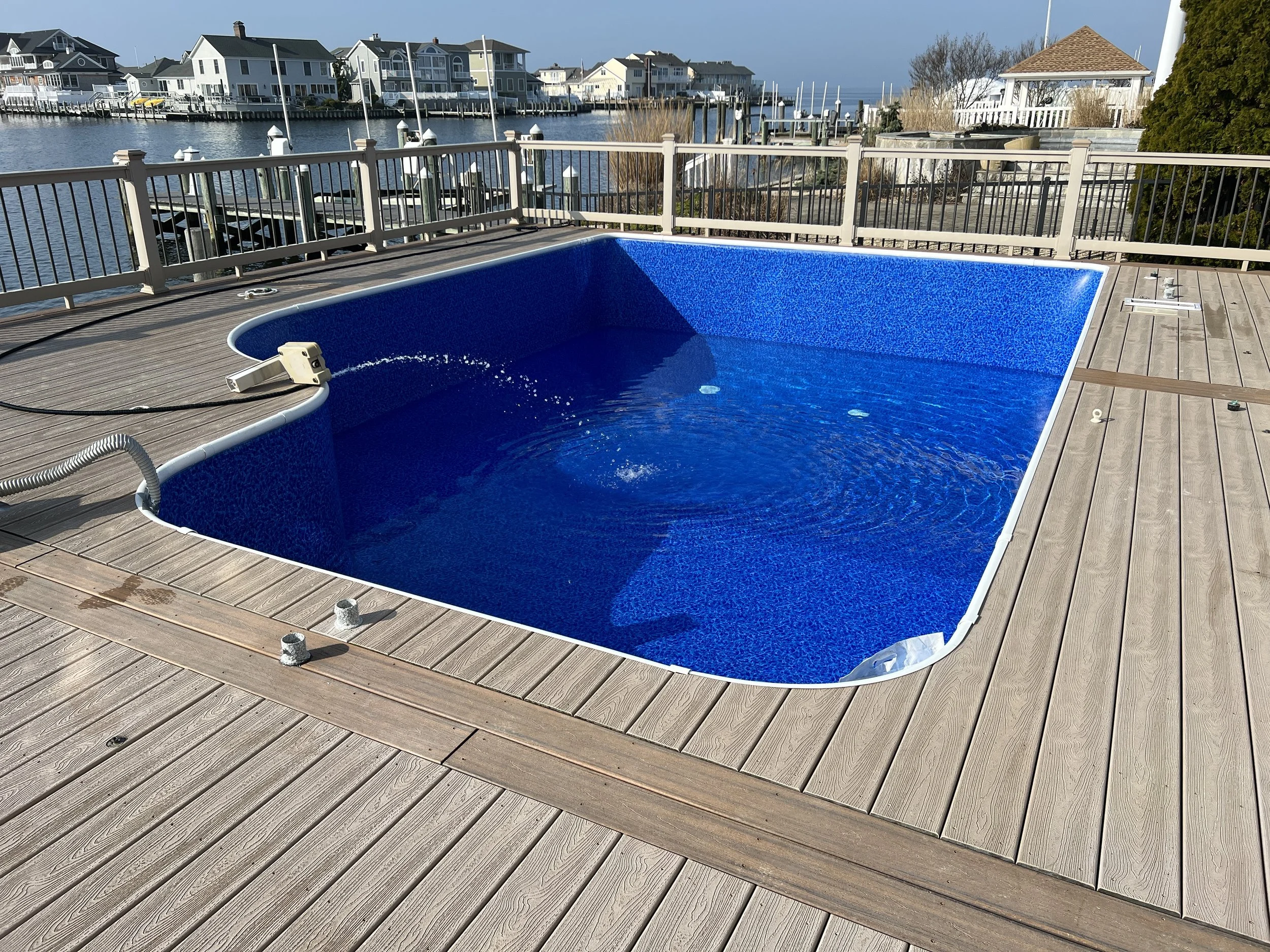 This liner features the Bradley Beach tile border, a decorative band that runs along the top of the pool, paired with the Dark Blue River pattern throughout the rest of the liner.