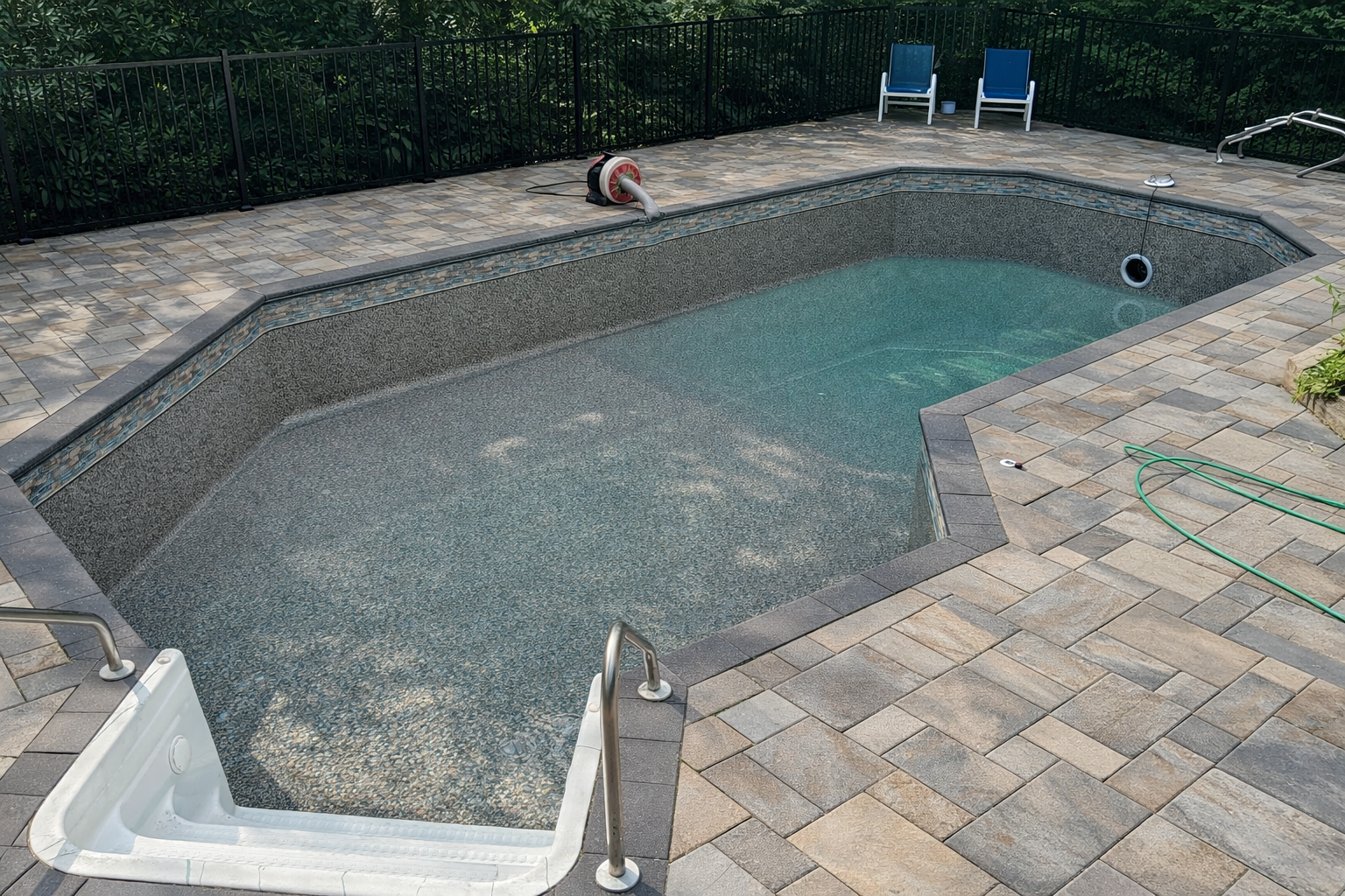 This liner features the Cliffwood Beach tile border, a decorative band that runs along the top of the pool, paired with the Verona pattern throughout the rest of the liner.