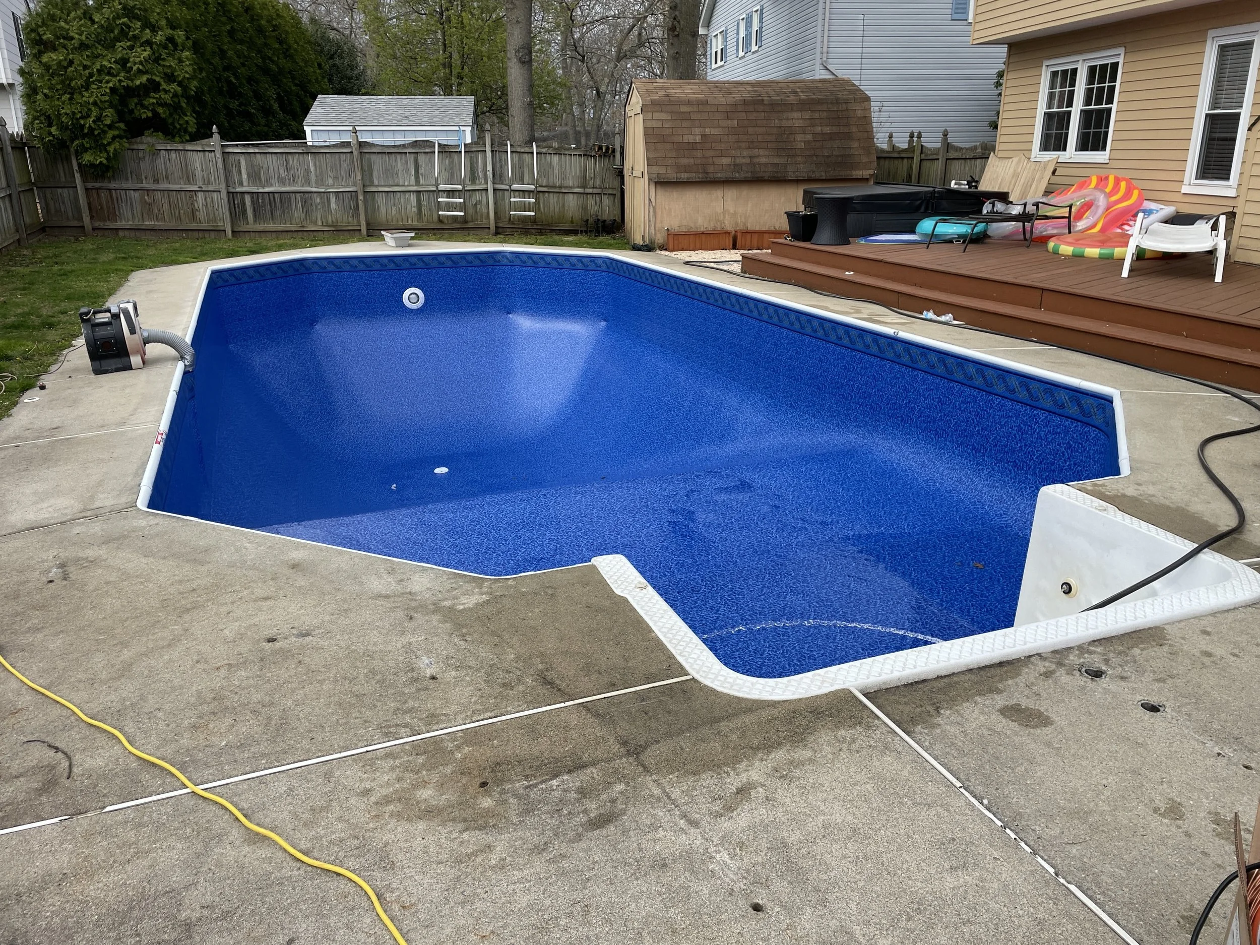This liner features the Howell tile border, a decorative band that runs along the top of the pool, paired with the Dark Blue River pattern throughout the rest of the liner.