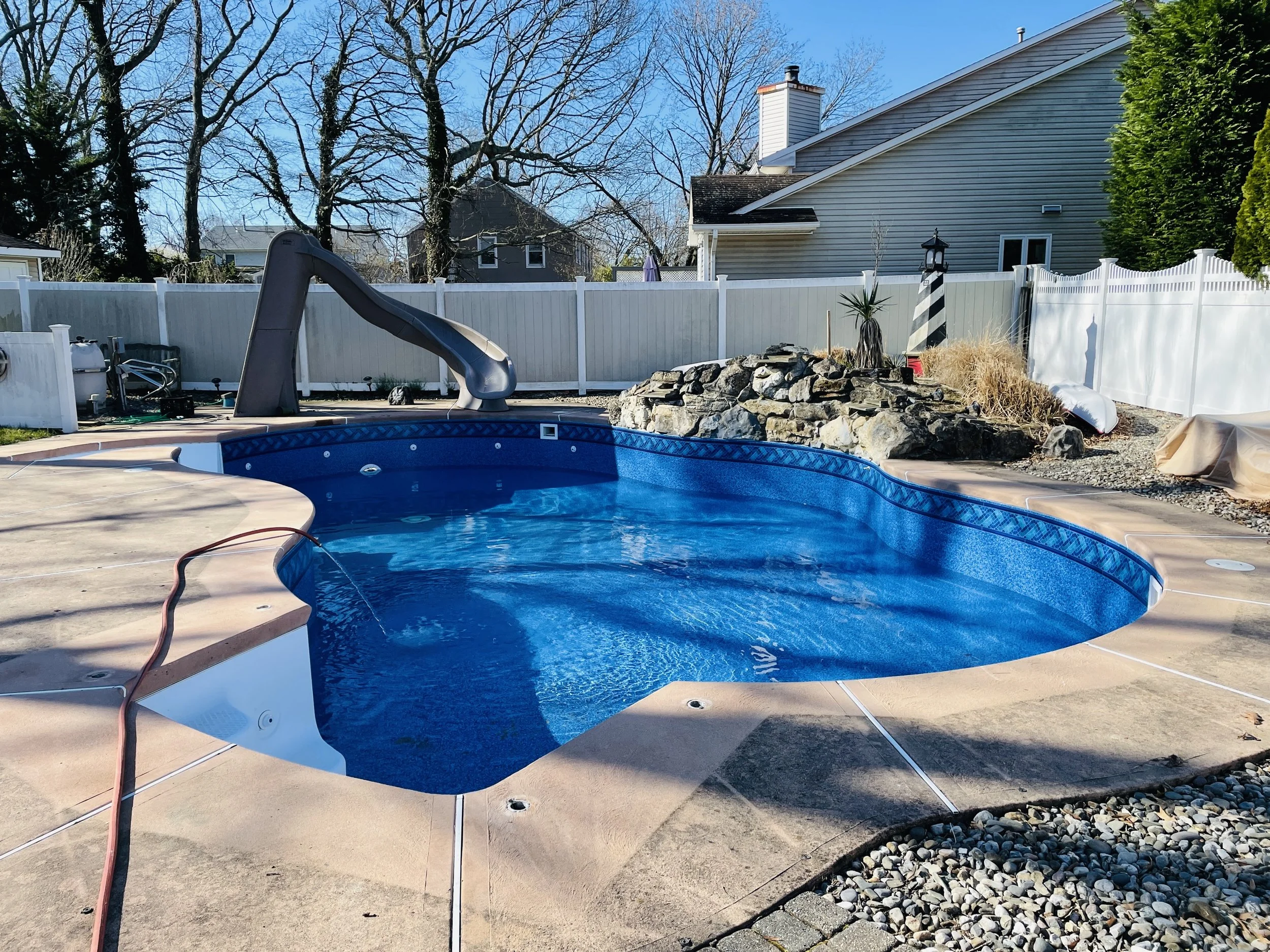 This liner features the Lanoka Harbor tile border, a decorative band that runs along the top of the pool, paired with the Blue Beach Pebble pattern throughout the rest of the liner.