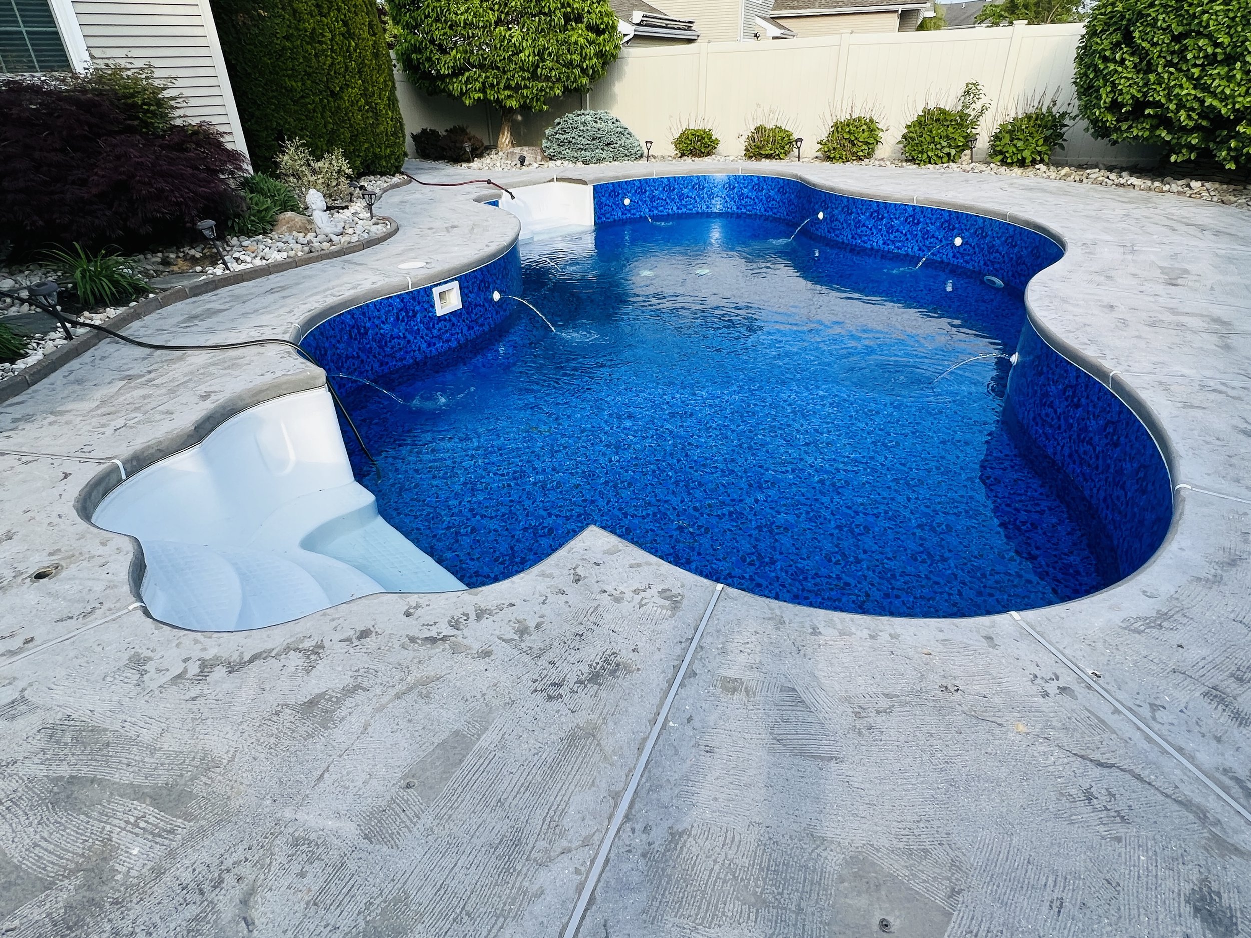 The Marmora liner features an all-over pattern. The deep blue and pearl effect of this pattern add a unique shimmer to the pool water.