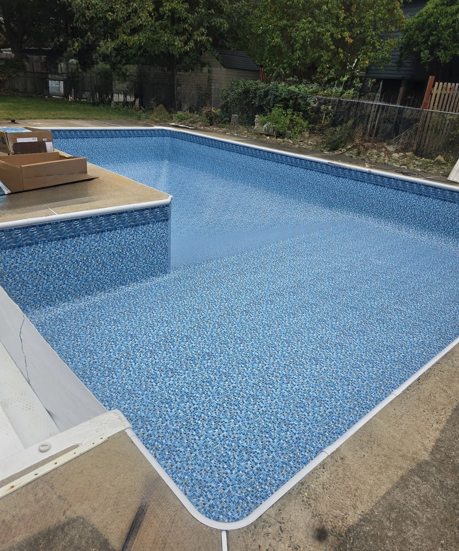 This liner features the Union Beach tile border, a decorative band that runs along the top of the pool, paired with the Bay Azule square mosaic tile pattern throughout the rest of the liner for a clean and classic pool finish.