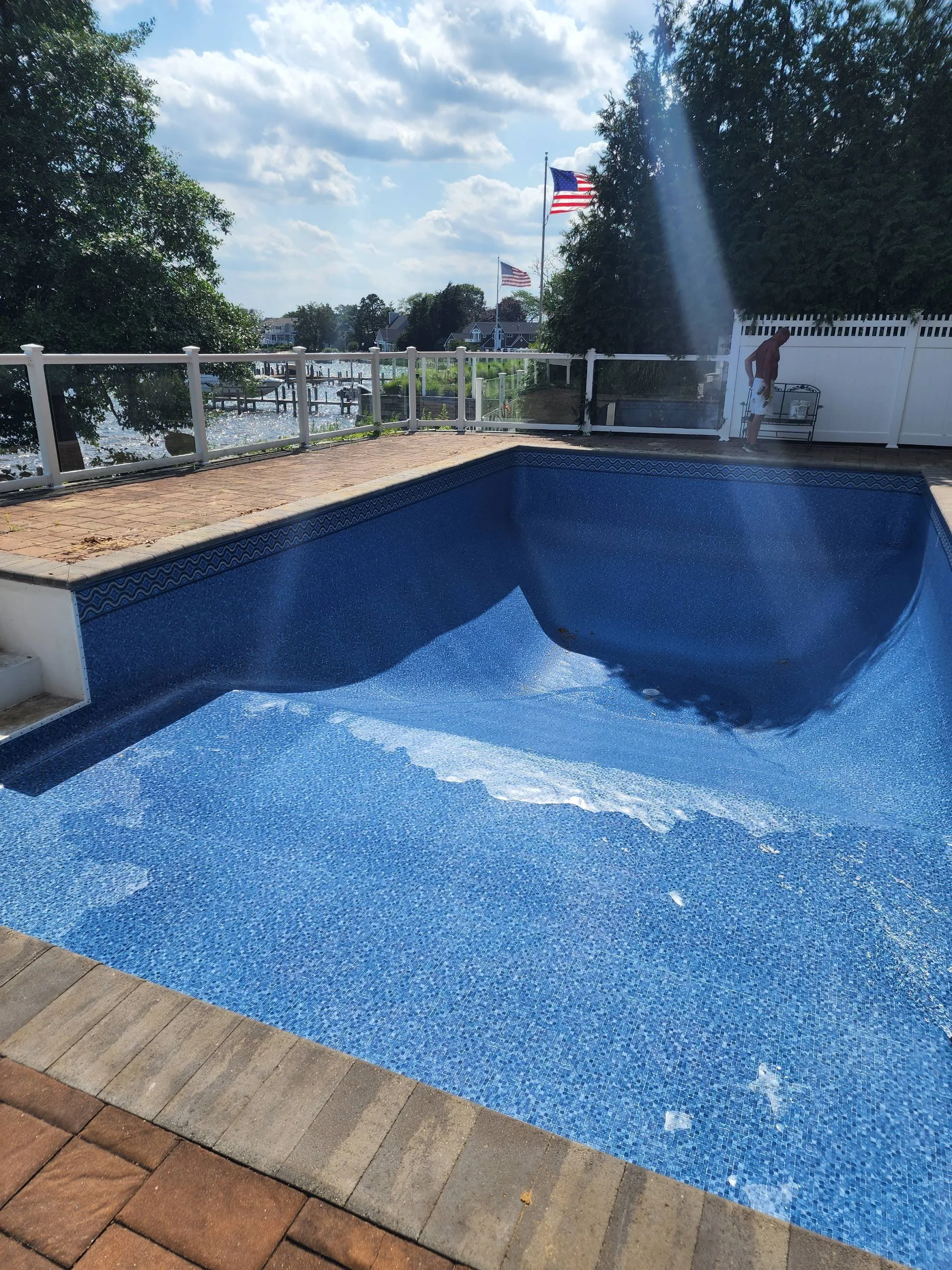 This liner features the West Creek tile border, a decorative band that runs along the top of the pool, paired with the Mosaic pattern throughout the rest of the liner.